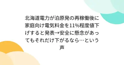 北海道電力が泊原発の再稼働後に家庭向け電気料金を11%程度値下げすると発表→安全に懸念があってもそれだけ下がるなら…という声