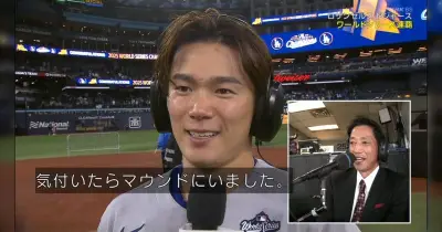 シャンパンファイト中にインタビューを受ける山本由伸「NHK!?さっき喋ったじゃないですかw」