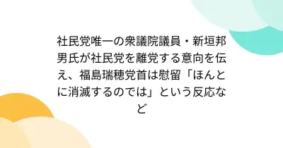 社民党唯一の衆議院議員・新垣邦男氏が社民党を離党する意向を伝え、福島瑞穂党首は慰留「ほんとに消滅するのでは」という反応など