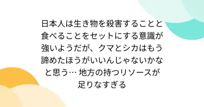 日本人は生き物を殺害することと食べることをセットにする意識が強いようだが、クマとシカはもう諦めたほうがいいんじゃないかなと思う… 地方の持つリソースが足りなすぎる