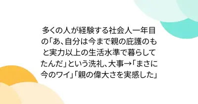 多くの人が経験する社会人一年目の「あ、自分は今まで親の庇護のもと実力以上の生活水準で暮らしてたんだ」という洗礼、大事→「まさに今のワイ」「親の偉大さを実感した」