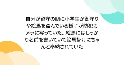自分が留守の間に小学生が御守りや絵馬を盗んでいる様子が防犯カメラに写っていた...絵馬にはしっかり名前を書いていて絵馬掛けにちゃんと奉納されていた