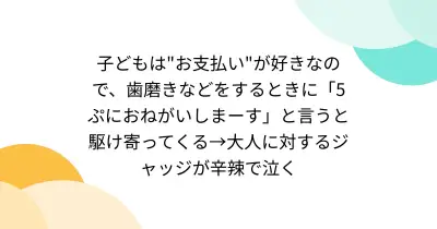 子どもは"お支払い"が好きなので、歯磨きなどをするときに「5ぷにおねがいしまーす」と言うと駆け寄ってくる→大人に対するジャッジが辛辣で泣く