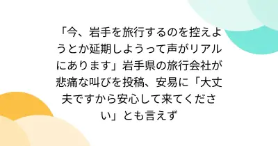 「今、岩手を旅行するのを控えようとか延期しようって声がリアルにあります」岩手県の旅行会社が悲痛な叫びを投稿、安易に「大丈夫ですから安心して来てください」とも言えず