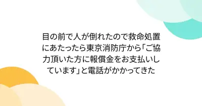 目の前で人が倒れたので救命処置にあたったら東京消防庁から「ご協力頂いた方に報償金をお支払いしています」と電話がかかってきた