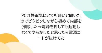 PCは静電気にとても弱いと聞いたのでビクビクしながら初めて内部を掃除した→電源を押しても起動しなくてやらかしたと思ったら電源コードが抜けてた