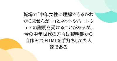 職場で「中年女性に理解できるかわかりませんが…」とネットやハードウェアの説明を受けることがあるが、今の中年世代の方々は黎明期から自作PCでHTMLを手打ちしてた人達である