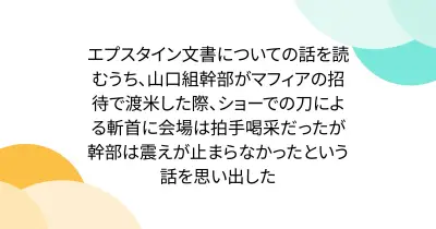 エプスタイン文書についての話を読むうち、山口組幹部がマフィアの招待で渡米した際、ショーでの刀による斬首に会場は拍手喝采だったが幹部は震えが止まらなかったという話を思い出した