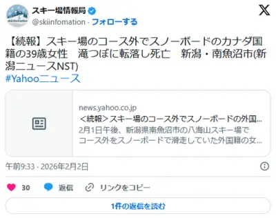 スキー場のコース外でスノーボードのカナダ国籍の39歳女性 滝つぼに転落し死亡 新潟・南魚沼市