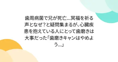 歯周病菌で兄が死亡...冥福を祈る声となぜ?と疑問集まるが、心臓疾患を抱えている人にとって歯磨きは大事だった「歯磨きキャンはやめよう...」