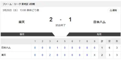 【vs.楽天 東地区 2回戦】2-1で負け
