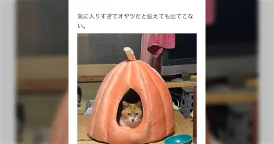猫の防寒対策に、カボチャ型の猫ベッドを購入→気に入りすぎた猫がオヤツに向かってカボチャのまま移動を試みるが、逆に遠ざかる自体に