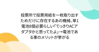 投票所で投票用紙を一枚取り出すためだけに存在するあの機械、単1電池8個必要らしい「てっきりACアダプタかと思ってたよ」→電池である事のメリットが挙がる