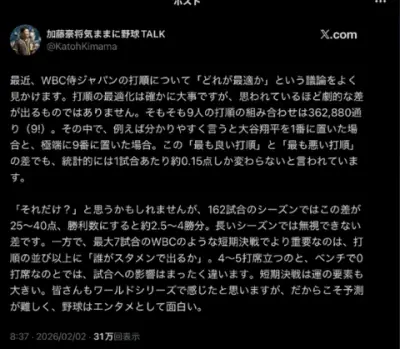 元メジャー選手「セイバーかじった素人がやたら打順に拘るけど、打順程度じゃ大した差出ないぞ」