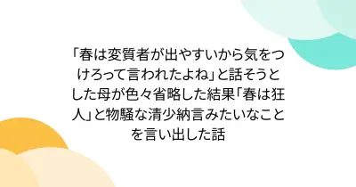 「春は変質者が出やすいから気をつけろって言われたよね」と話そうとした母が色々省略した結果「春は狂人」と物騒な清少納言みたいなことを言い出した話