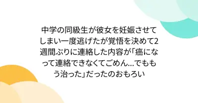中学の同級生が彼女を妊娠させてしまい一度逃げたが覚悟を決めて2週間ぶりに連絡した内容が「癌になって連絡できなくてごめん...でももう治った」だったのおもろい