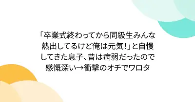 「卒業式終わってから同級生みんな熱出してるけど俺は元気!」と自慢してきた息子、昔は病弱だったので感慨深い→衝撃のオチでワロタ