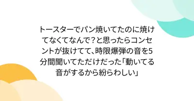 トースターでパン焼いてたのに焼けてなくてなんで?と思ったらコンセントが抜けてて、時限爆弾の音を5分間聞いてただけだった「動いてる音がするから紛らわしい」