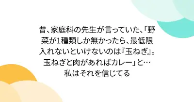 昔、家庭科の先生が言っていた、「野菜が1種類しか無かったら、最低限入れないといけないのは『玉ねぎ』。玉ねぎと肉があればカレー」と… 私はそれを信じてる