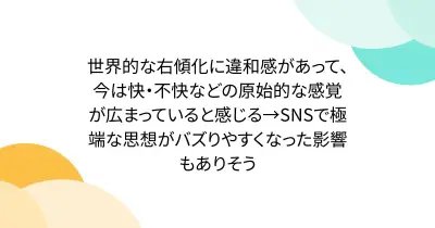 世界的な右傾化に違和感があって、今は快・不快などの原始的な感覚が広まっていると感じる→SNSで極端な思想がバズりやすくなった影響もありそう