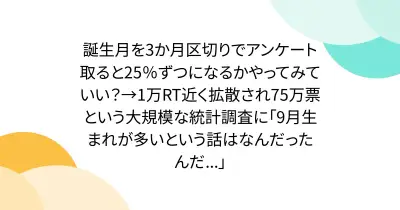 誕生月を3か月区切りでアンケート取ると25%ずつになるかやってみていい?→1万RT近く拡散され75万票という大規模な統計調査に「9月生まれが多いという話はなんだったんだ...」