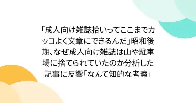 「成人向け雑誌拾いってここまでカッコよく文章にできるんだ」昭和後期、なぜ成人向け雑誌は山や駐車場に捨てられていたのか分析した記事に反響「なんて知的な考察」
