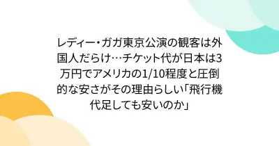 レディー・ガガ東京公演の観客は外国人だらけ…チケット代が日本は3万円でアメリカの1/10程度と圧倒的な安さがその理由らしい「飛行機代足しても安いのか」