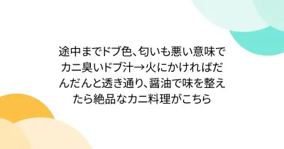 途中までドブ色、匂いも悪い意味でカニ臭いドブ汁→火にかければだんだんと透き通り、醤油で味を整えたら絶品なカニ料理がこちら