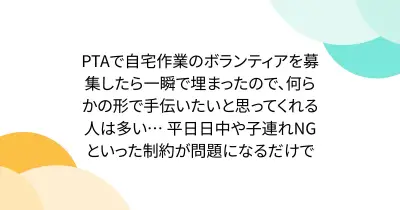 PTAで自宅作業のボランティアを募集したら一瞬で埋まったので、何らかの形で手伝いたいと思ってくれる人は多い… 平日日中や子連れNGといった制約が問題になるだけで