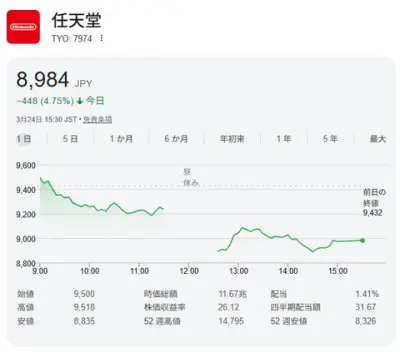 任天堂株価、午後に一段と下落 「スイッチ2を200万台減産」報道