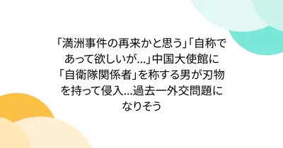 「満洲事件の再来かと思う」「自称であって欲しいが...」中国大使館に「自衛隊関係者」を称する男が刃物を持って侵入...過去一外交問題になりそう