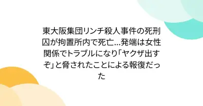 東大阪集団リンチ殺人事件の死刑囚が拘置所内で死亡...発端は女性関係でトラブルになり「ヤクザ出すぞ」と脅されたことによる報復だった
