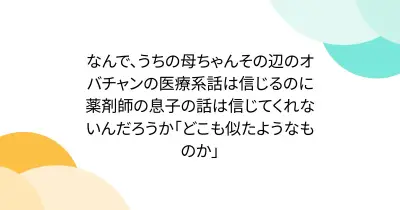 なんで、うちの母ちゃんその辺のオバチャンの医療系話は信じるのに薬剤師の息子の話は信じてくれないんだろうか「どこも似たようなものか」