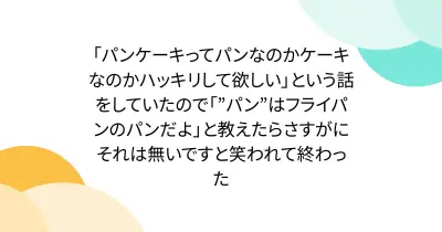 「パンケーキってパンなのかケーキなのかハッキリして欲しい」という話をしていたので「”パン”はフライパンのパンだよ」と教えたらさすがにそれは無いですと笑われて終わった