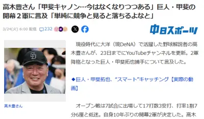 高木豊「甲斐キャノン…今はなくなりつつある」巨人・甲斐の開幕2軍に言及