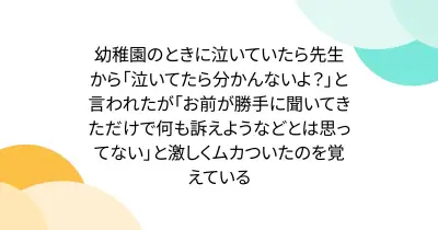 幼稚園のときに泣いていたら先生から「泣いてたら分かんないよ?」と言われたが「お前が勝手に聞いてきただけで何も訴えようなどとは思ってない」と激しくムカついたのを覚えている