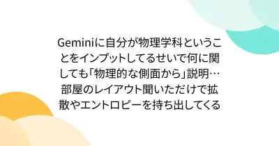 Geminiに自分が物理学科ということをインプットしてるせいで何に関しても「物理的な側面から」説明… 部屋のレイアウト聞いただけで拡散やエントロピーを持ち出してくる