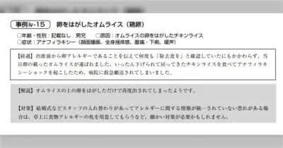卵アレルギーを事前に伝えていたが卵の乗ったオムライスが出てくる→作り直しをせず卵をはがして再度出したためアレルギー症状が出て緊急搬送された事例がある