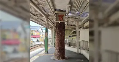 服部天神駅のホームには御神木が突き破っており神気あふれる光景、箕島駅の大楠木を想起するヒトも