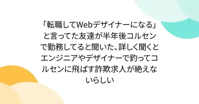 「転職してWebデザイナーになる」と言ってた友達が半年後コルセンで勤務してると聞いた、詳しく聞くとエンジニアやデザイナーで釣ってコルセンに飛ばす詐欺求人が絶えないらしい