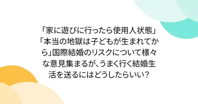 「家に遊びに行ったら使用人状態」「本当の地獄は子どもが生まれてから」国際結婚のリスクについて様々な意見集まるが、うまく行く結婚生活を送るにはどうしたらいい?