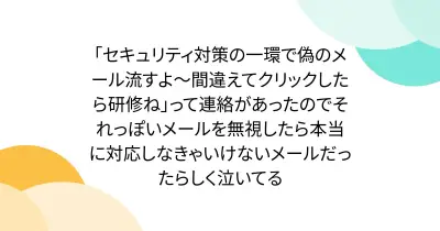 「セキュリティ対策の一環で偽のメール流すよ~間違えてクリックしたら研修ね」って連絡があったのでそれっぽいメールを無視したら本当に対応しなきゃいけないメールだったらしく泣いてる