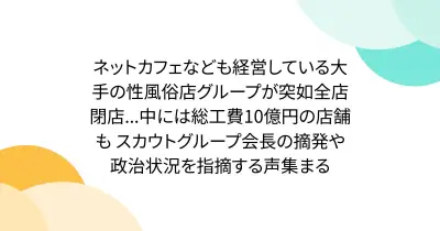 ネットカフェなども経営している大手の性風俗店グループが突如全店閉店...中には総工費10億円の店舗も スカウトグループ会長の摘発や政治状況を指摘する声集まる