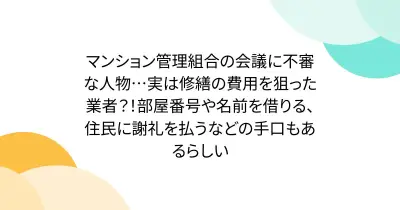 マンション管理組合の会議に不審な人物…実は修繕の費用を狙った業者?!部屋番号や名前を借りる、住民に謝礼を払うなどの手口もあるらしい