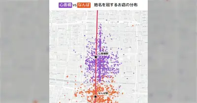 大阪の心斎橋vsなんばの地名が入ってる店に印つけたら、わりと境目が見えて興味深い→「そこは違うやろ」みたいなとこもある
