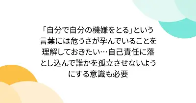 「自分で自分の機嫌をとる」という言葉には危うさが孕んでいることを理解しておきたい…自己責任に落とし込んで誰かを孤立させないようにする意識も必要