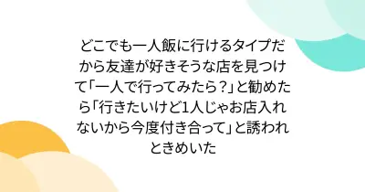 どこでも一人飯に行けるタイプだから友達が好きそうな店を見つけて「一人で行ってみたら?」と勧めたら「行きたいけど1人じゃお店入れないから今度付き合って」と誘われときめいた