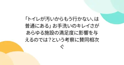 「トイレが汚いからもう行かない、は普通にある」 お手洗いのキレイさがあらゆる施設の満足度に影響を与えるのでは?という考察に賛同相次ぐ