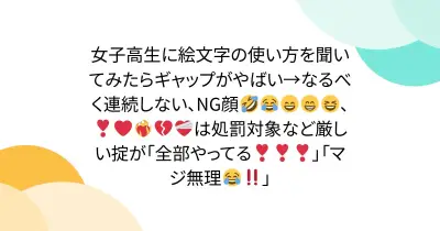 女子高生に絵文字の使い方を聞いてみたらギャップがやばい→なるべく連続しない、NG顔🤣😂😄😁😆、❣️❤️❤️🔥💔❤️🩹は処罰対象など厳しい掟が多数「全部やってる❣️❣️❣️」「マジ無理😂‼️」