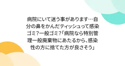 病院にいて迷う事があります…自分の鼻をかんだティッシュって感染ゴミ?一般ゴミ?「病院なら特別管理一般廃棄物にあたるから、感染性の方に捨てた方が良さそう」